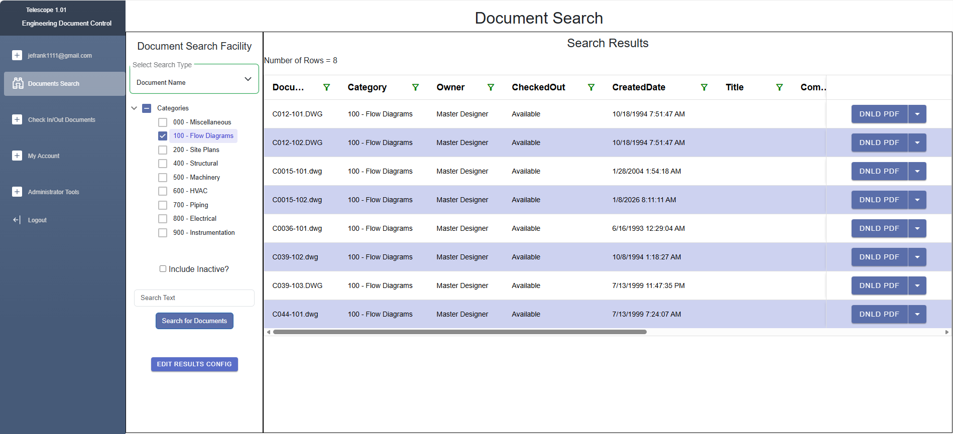 The document search page is the heart of Telescope. This unlocks access to the stored drawings and documents allowing a user to quick locate the pertinent drawings and documents. The search function is easy and intuitive, drawings can be downloaded as a PDF for easy viewing or in their original form.