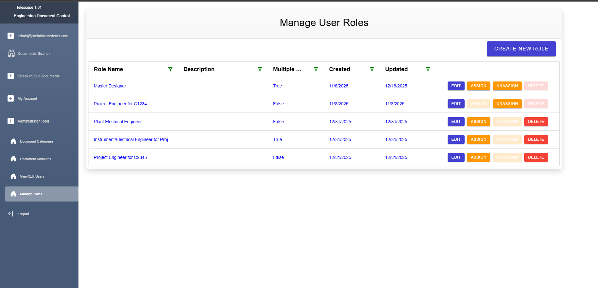 User roles define document ownership and check-in/check-out workflows within Telescope. On initial check-in, documents are assigned to a specific user role, when documents are checked out, they are checked out to a specific user role. User roles can be assigned to individual users or to groups of users.